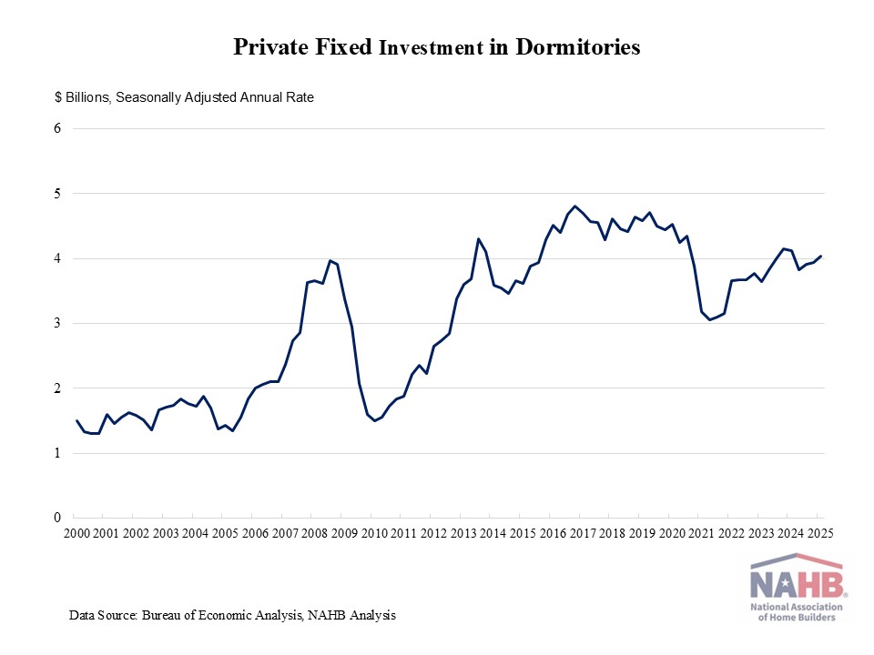 Private fixed investment in student dormitories increased by 2.3% in the first quarter of 2025, reaching a seasonally adjusted annual rate (SAAR) of $4.04 billion. This gain followed a 1.0% increase in the previous quarter. However, private fixed investment in dorms was 2% lower than a year ago, as elevated interest rates place a damper on student housing construction.