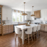 Special features. “Twelve-foot ceilings create a dramatic sense of openness, and textured wallpaper adds depth and softness,” Leferink says. “A warm wood console table with sleek lines has black baskets underneath for storing flip-flops and daily essentials. A timeless six-bulb chandelier anchors the space without overwhelming it. A piece of abstract art and a soft, light-toned rug ground the space. Black hardware adds a crisp, modern contrast, and classic green plants bring a natural, vibrant touch.”
