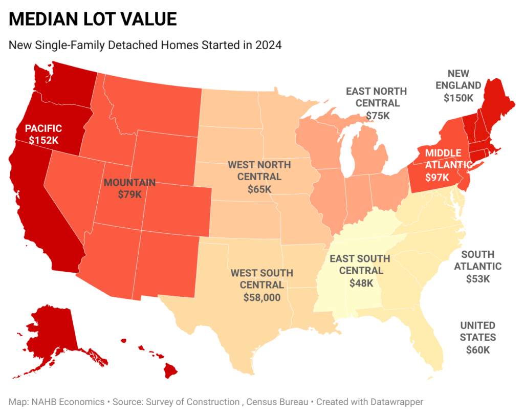 Despite shrinking lot sizes, values for single-family detached spec home lots continued to rise, with the national median outpacing U.S. inflation and reaching a new high in 2024. The U.S. median lot value for single-family detached for-sale homes started in 2024 stood at $60,000, according to NAHB’s analysis of the Census Bureau’s Survey of Construction (SOC) data.