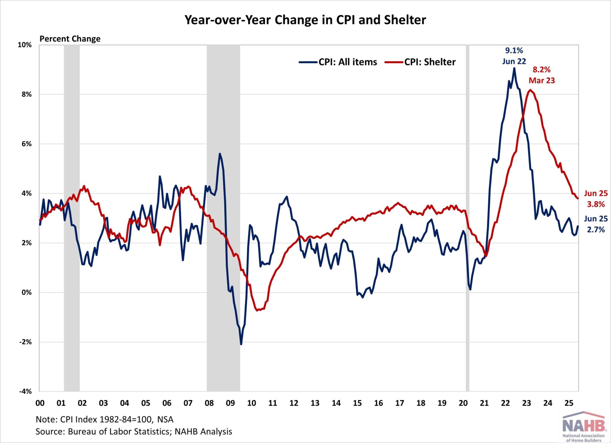 Inflation rose to a 4-month high in June as consumer prices began to reflect tariff policy. The Consumer Price Index increased from 2.4% in May to 2.7% in June year-over-year, according to the Bureau of Labor Statistics’ report. Despite the increase, core inflation came in softer than expected, suggesting full tariff impacts will likely push inflation even higher in the coming months. Meanwhile, housing inflation continued to show signs of cooling and matched the lowest level since November 2021.