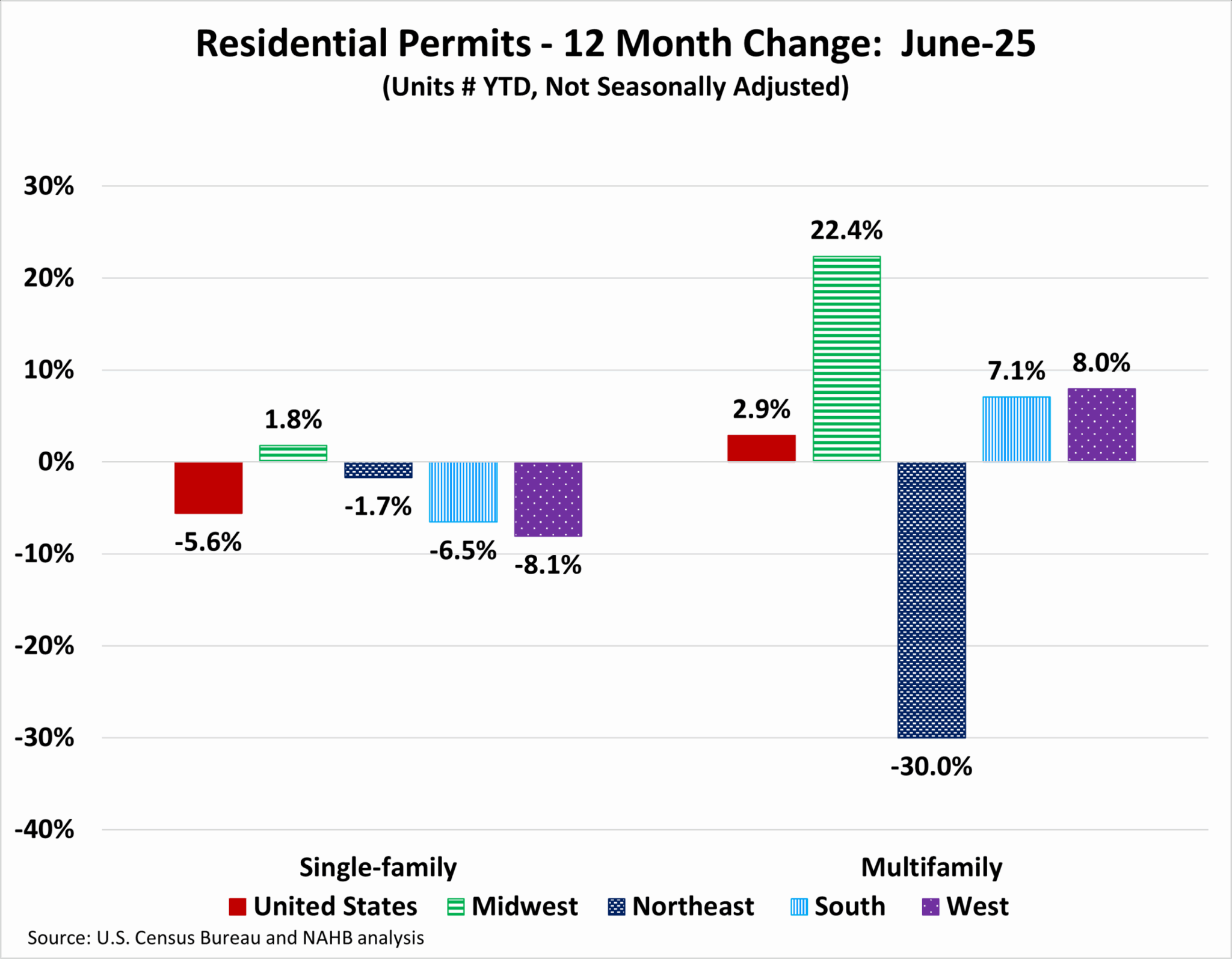 Year-to-date ending in June, single-family permits were up in one out of the four regions. The Midwest posted a small increase of 1.8%. The Northeast was 1.7% lower, the South was down by 6.5%, and the West was down by 8.1% in single-family permits during this time. For multifamily permits, three out of the four regions posted increases. The Midwest was up by 22.4%, the West was up by 8.0%, and the South was up by 7.1%, Meanwhile, the Northeast declined steeply by 30.0%, driven by the New York-Newark-Jersey City, NY-NJ MSA which declined by 40.0%.