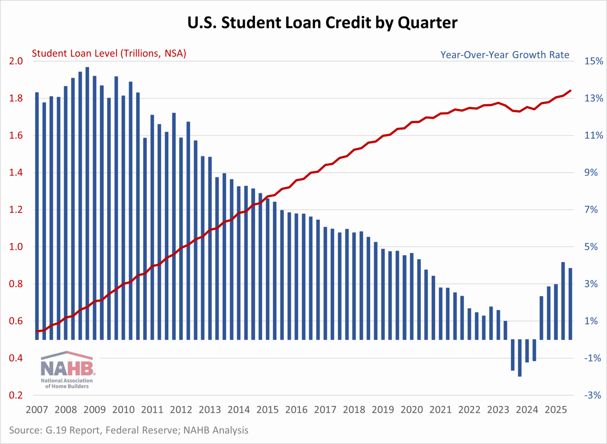 Student loan debt stood at $1.84 trillion (NSA) for the third quarter of 2025, marking a 3.84% increase from a year ago. The end of the COVID-19 Emergency Relief—which allowed 0% interest and halted payments until September 1, 2023—led year-over-year growth to decline for four consecutive quarters, from Q3 2023 through Q2 2024 as borrowers resumed payments and took on less new debt. The past five quarters have shown a return to growth, nearly matching pre-pandemic growth rates.