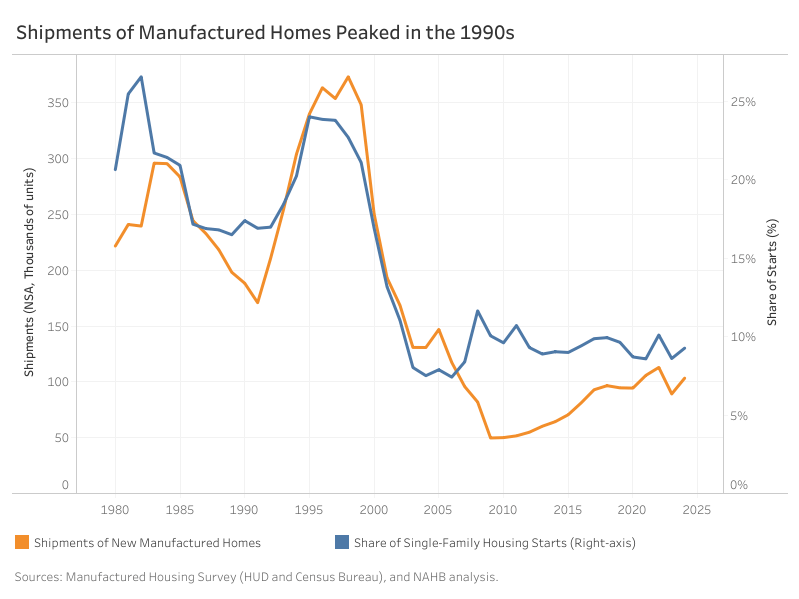The 1990s saw a surge in manufactured home shipments, peaking in 1998. During this period, manufactured homes constituted 17% to 24% of new single-family homes. However, shipments declined in the early 2000s, coinciding with a rapid increase in site-built housing construction leading up to the 2008 housing crisis. Since then, manufactured homes have stabilized at around 9% to 10% of new housing.