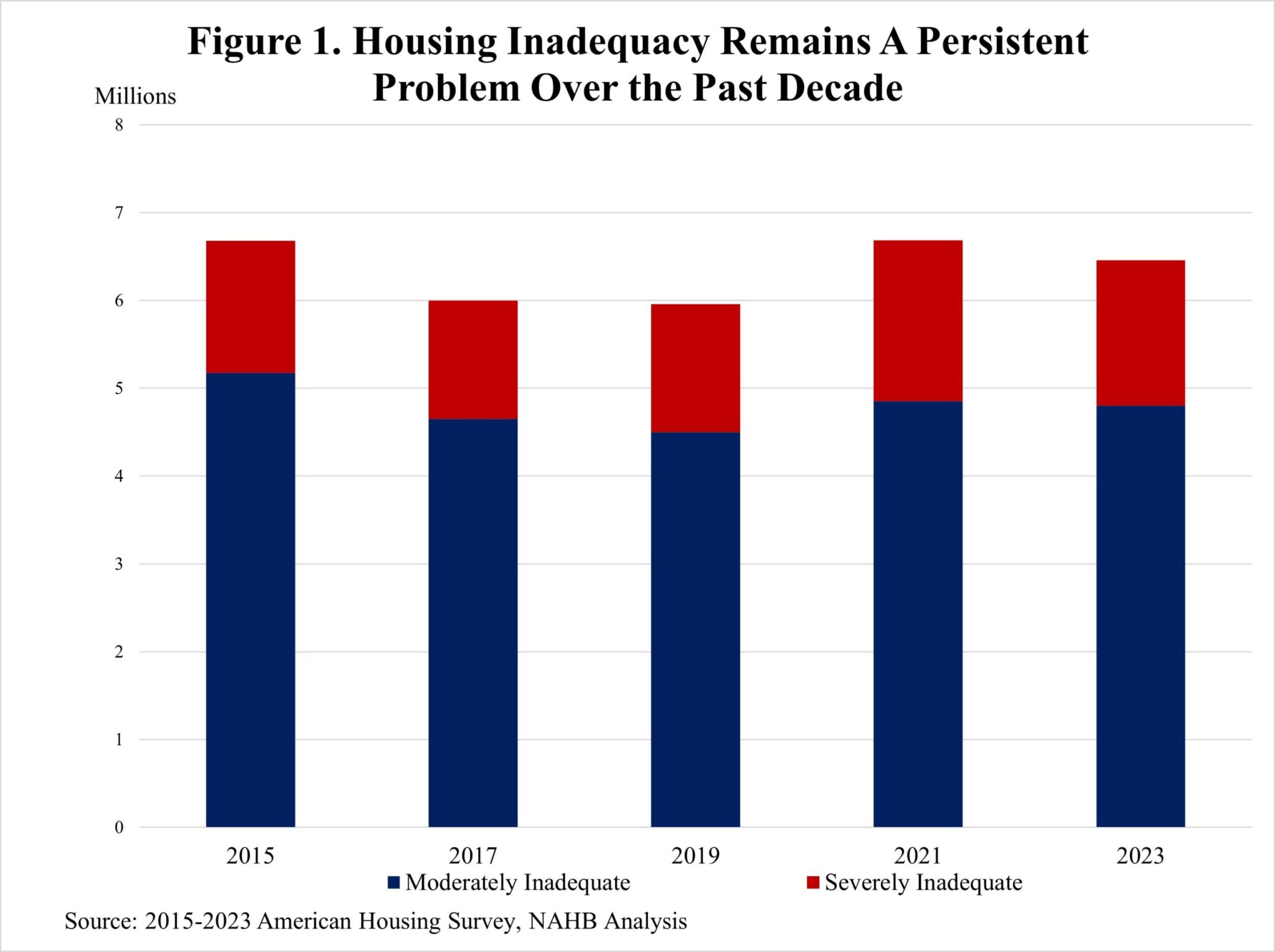 Housing inadequacy has remained a persistent issue over the past decade, shown in Figure 1. In 2023, around 6.5 million households lived in moderately or severely inadequate housing. While the total number of inadequate homes declined slightly from 6.9 million in 2015 to 6.0 million in 2019, it rebounded to 6.7 million in 2021 and remained elevated in 2023. The majority, around 4.8 million, of inadequate homes were moderately inadequate, while 1.65 million households lived in severely inadequate conditions in 2023.