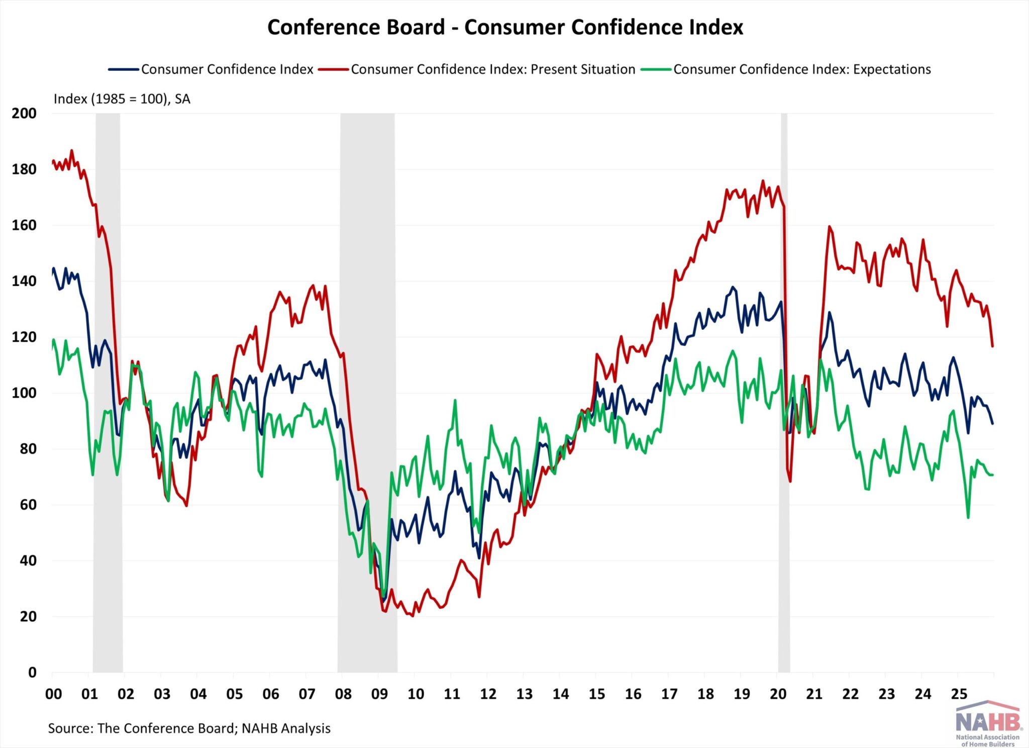 The Consumer Confidence Index, reported by the Conference Board, is a survey measuring how optimistic or pessimistic consumers feel about their financial situation. This index fell from 92.9 to 89.1 in December, the lowest level since April. The Consumer Confidence Index consists of two components: how consumers feel about their present situation and their expected situation. In September, the Present Situation Index decreased 9.5 points from 126.3 to 116.8, the largest monthly decline since September 2024; the Expectation Situation Index dropped remained unchanged at 70.7. This is the eleventh consecutive month that the Expectation Index has been below 80, a threshold that often signals a recession within a year.