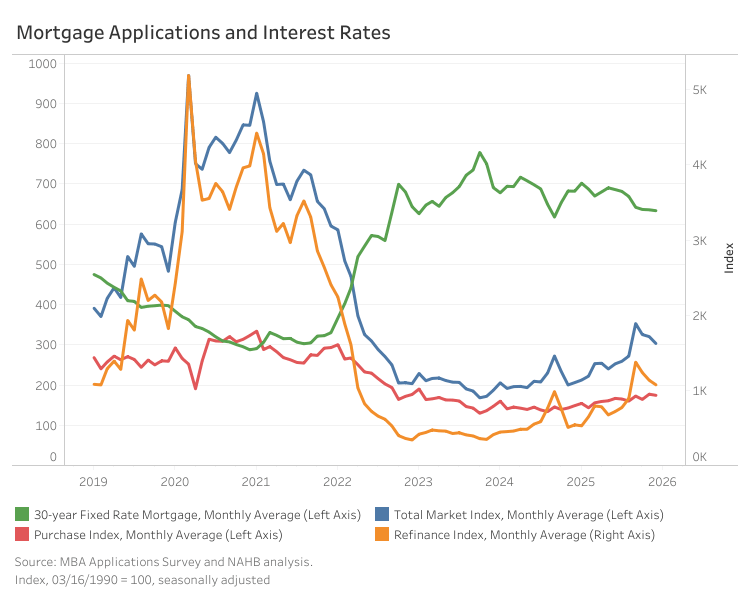 The average contract interest rate for 30-year fixed mortgages edged down 2 basis points to 6.3%, the lowest level of 2025. Nonetheless, both purchase and refinance applications declined month-over-month, down 1.6% and 5.3%, respectively. Relative to December 2024, purchase activity increased 16.8%, while refinance applications were up 98.6%.