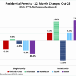 The NAHB construction spending index is shown in the graph below. The index illustrates how   spending on single-family construction has slowed since early 2024 under the pressure of elevated interest rates and concerns over building material tariffs. Multifamily construction spending growth has also slowed down after the peak in July 2023, with the index largely plateauing since late 2024. In contrast, improvement spending has been on an upward trend since the beginning of 2025.