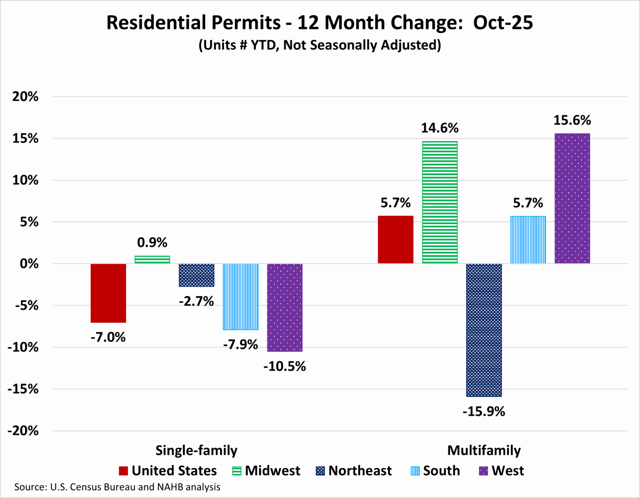At the state level, 15 states recorded year-over-year increases in single-family permits between October 2025 year-to-date and October 2024 year-to-date, with gains ranging from 12.6 percent in New Hampshire to 0.8 percent in West Virginia. The remaining 35 states and the District of Columbia reported declines, led by Nevada, which posted the steepest drop at 22.4 percent.