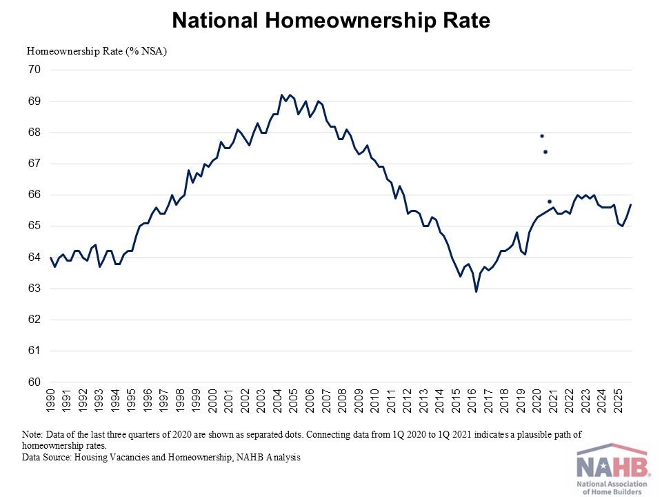 The latest homeownership rate rose to 65.7% in the last quarter of 2025, according to the Census’s Housing Vacancy Survey (HVS). While this was a modest quarterly increase, the broader picture continues to reflect significant affordability challenges. With mortgage interest rates remaining elevated, and housing supply still tight, housing affordability is at a multidecade low.