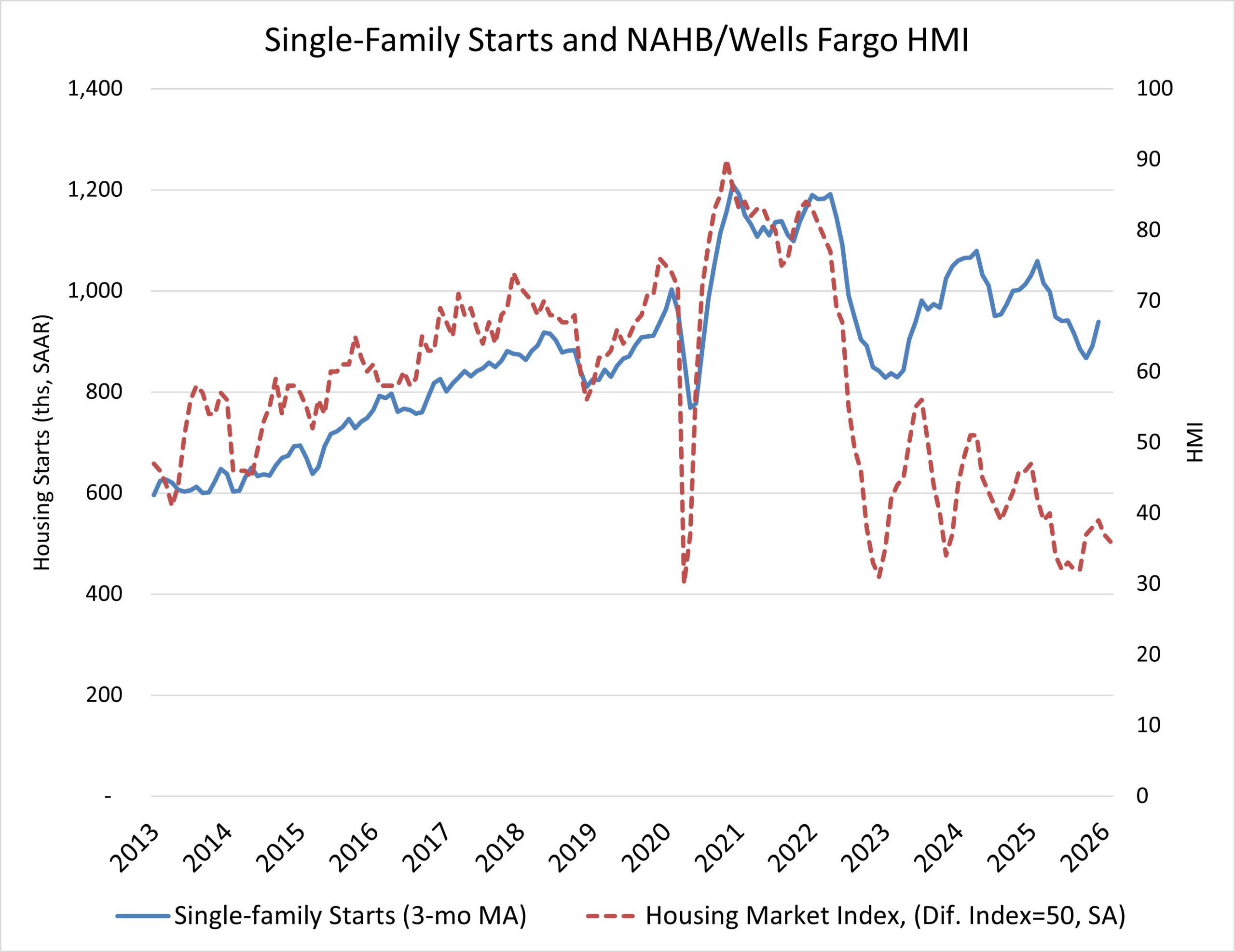 Total housing starts for 2025 were 1.36 million, down 0.6% from the 1.37 million total in 2024. Single-family starts in 2025 totaled 943,000, down 6.9% from the previous year. Multifamily starts ended the year up 17.4% compared with 2024.