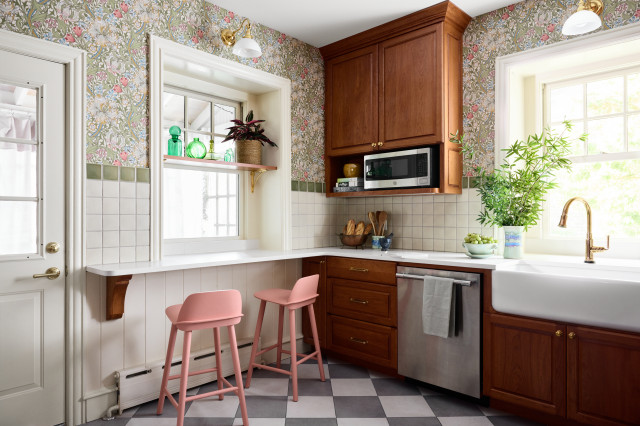 Designer Sean Lewis reworked the kitchen within the existing footprint, removing the peninsula and relocating appliances to create better flow. Ceiling-height cherry cabinetry packed with smart storage solutions maximizes every square foot, while a floating quartz counter with playful pink stools adds prep space and a kid-friendly homework area. Finished with lively floral wallpaper and classic checkerboard porcelain tile flooring, the refreshed kitchen now feels like a bright jewel-box hub for the whole family.