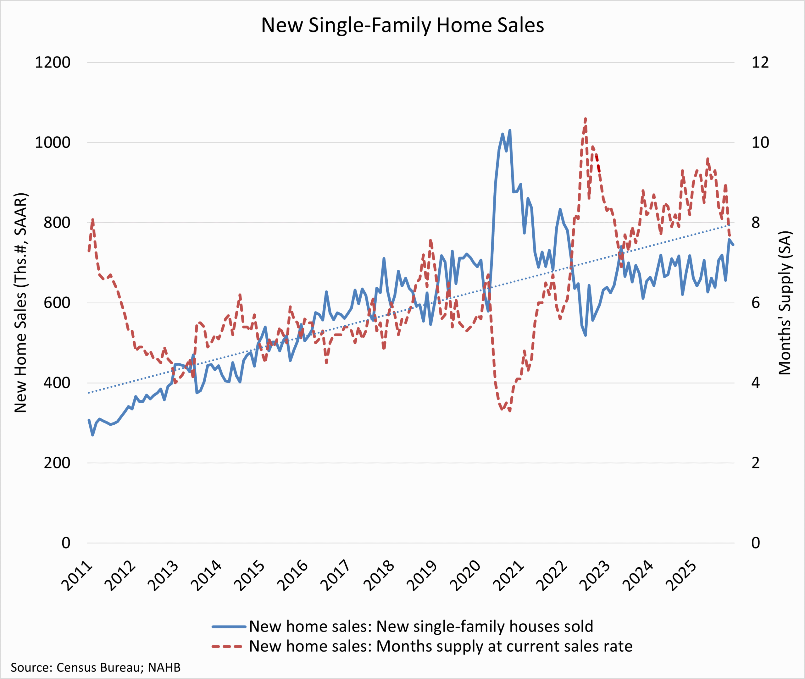 New home sales ended 2025 on a mixed but resilient note, signaling steady underlying demand despite ongoing affordability and supply constraints. The latest data released today (and delayed because of the government shutdown in fall of 2025) indicate that while month-to-month activity shows a small decline, sales remain stronger than a year ago, signaling that buyer interest in newly built homes has improved. The December NAHB/Wells Fargo Housing Market Index showed that 67 percent of builders used sales incentives, the highest percentage post-COVID. Builders offered an average home price reduction of 5 percent during December.