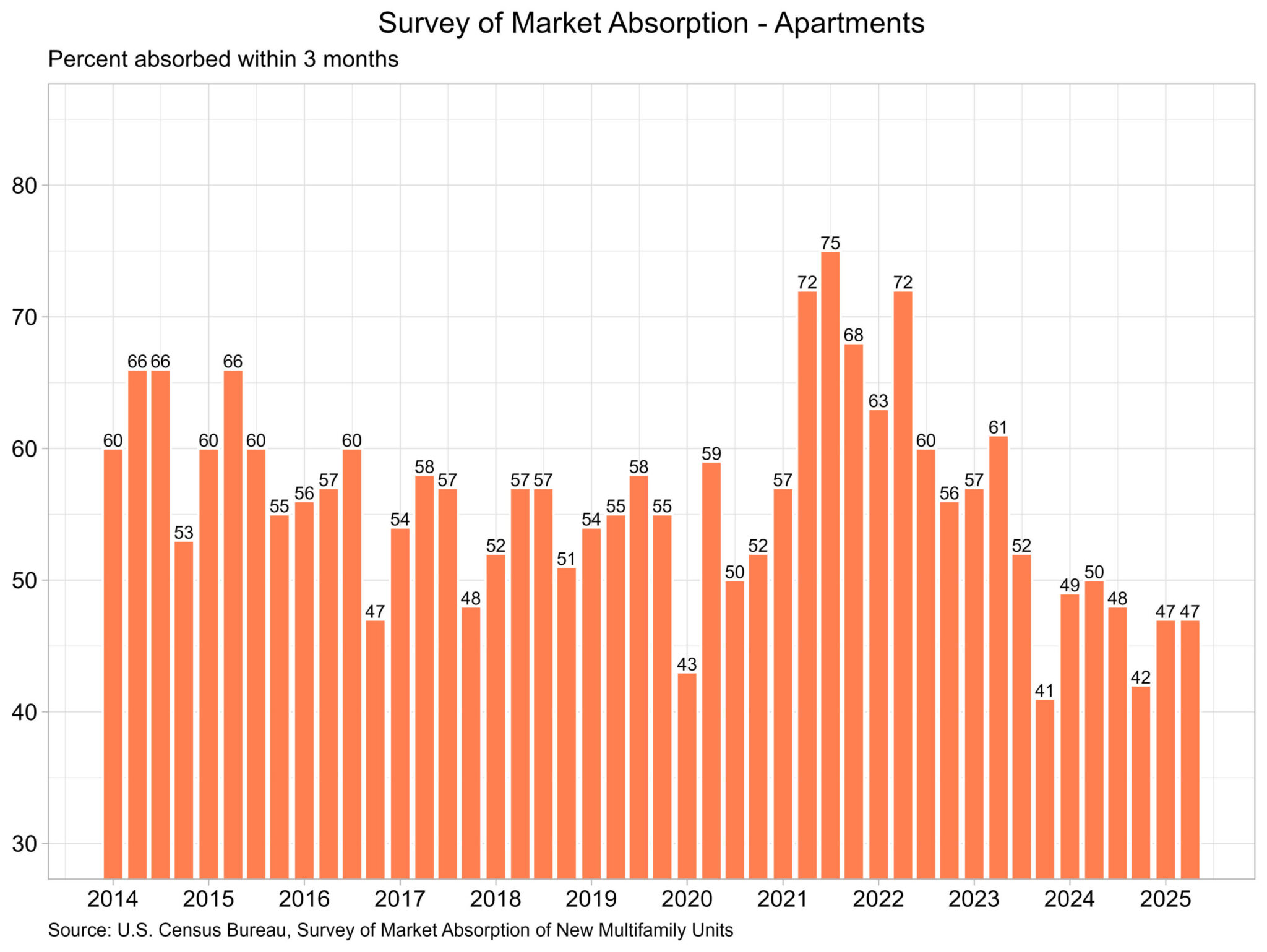 Along with the three-month absorption rate and completions, SOMA also reports absorption rates at six, nine, and twelve months after completion. For apartments completed six months ago (93,400 units), 70% have been absorbed into the market. Of the 125,100 apartments completed nine months ago, 85% have been absorbed. For those completed twelve months ago (142,700 units), 91% were absorbed into the multifamily market.