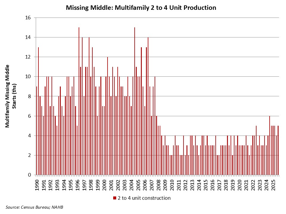 As a share of all multifamily production, 2- to 4-unit development was just 5% of total multifamily development for the fourth quarter. This remains lower than recent historical trends. From 2000 to 2010, such home construction made up a little less than 11% of total multifamily construction.