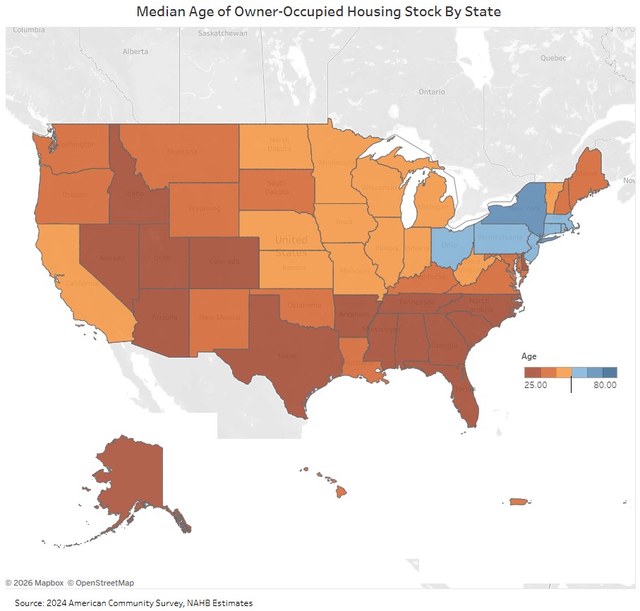 The age of the owner-occupied housing stock varies greatly across 50 states. New York has the oldest owner-occupied homes with a median age of 64 years, followed by Massachusetts (59), and Rhode Island (59). Half of all owner-occupied houses in the District of Columbia were built more than 80 years ago. However, D.C. is generally not a representative market, given its smaller size and highly urbanized environment.