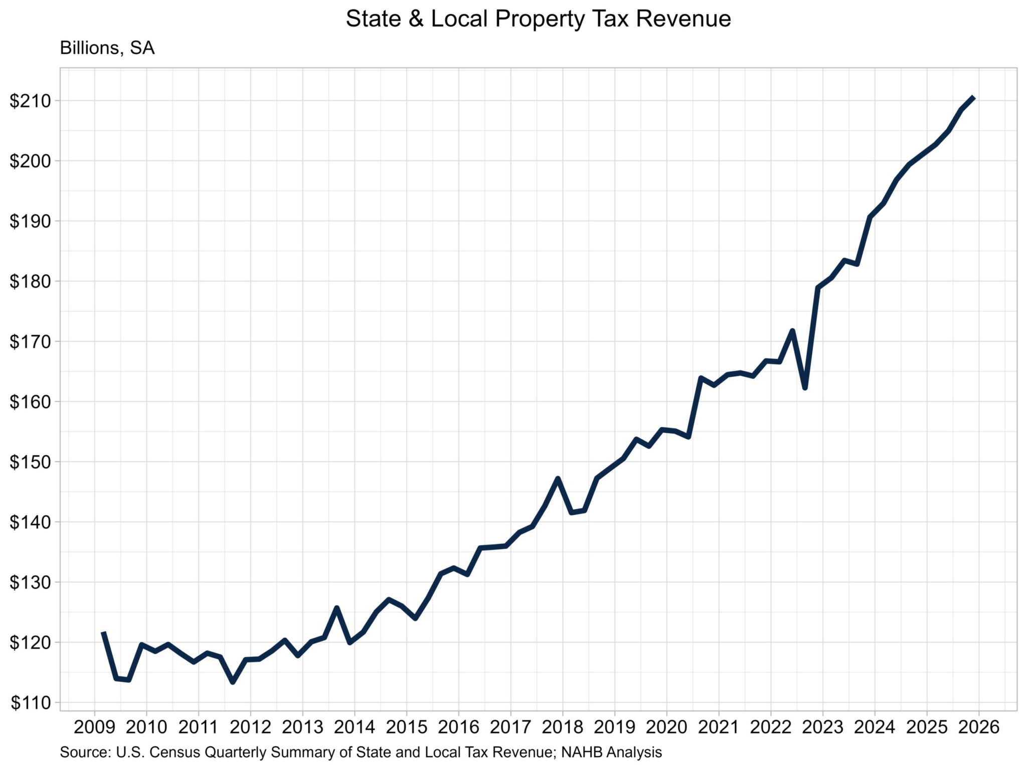 Property tax revenue collected by state and local governments rose for the ninth consecutive quarter according to the Census Bureau’s quarterly summary of state and local tax revenue. Total tax revenue for state and local governments increased 2.1% over the quarter, with individual income tax revenue up 1.4%, sales tax revenue up 2.5%, and corporate income tax revenue up 8.3%. Property tax revenue rose the least amount over the quarter, up 1.0%. For 2025, state and local tax collections totaled $2.2 trillion, with property taxes accounting for $826.8 billion (37.5%).