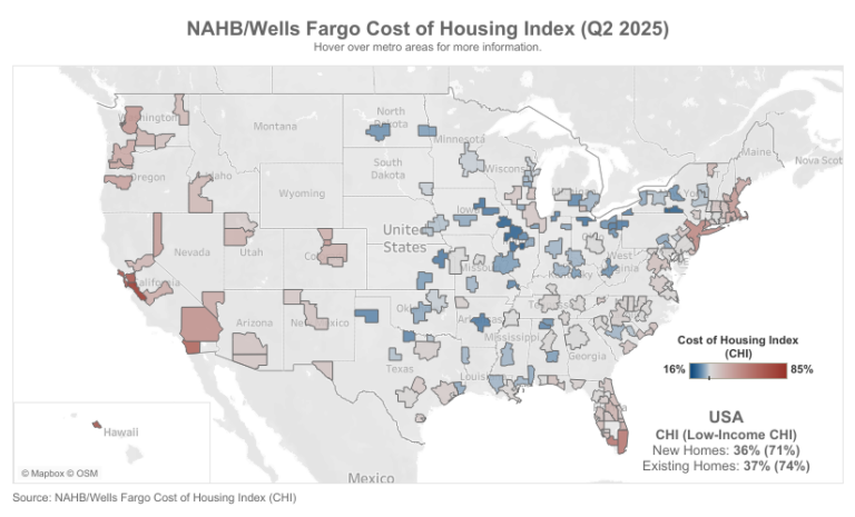 While new homes remain largely unaffordable, builder efforts to improve housing affordability paid dividends in the second quarter of 2025, according to the latest data from the National Association of Home Builders (NAHB)/Wells Fargo Cost of Housing Index (CHI). The CHI results from the second quarter of 2025 show that a family earning the nation’s median income of $104,200 needed 36% of its income to cover the mortgage payment on a median-priced new home. Low-income families, defined as those earning only 50% of median income, would have to spend 71% of their earnings to pay for the same new home.