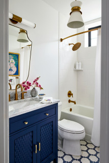 Designer Tammara Stroud, discovered by the homeowner on Houzz, brought vintage flair to this 1904 Seattle bungalow powder room with a William Morris botanical wallpaper. Paired with glass-and-brass sconces, crystal hardware and a hammered brass mirror frame, the wallpaper amplifies the Craftsman-style charm while adding sophisticated, timeless style to the small space.