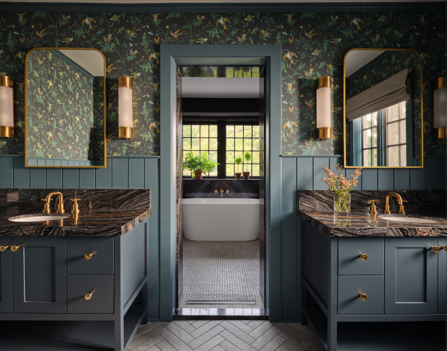 The right wallcovering can take a basic bathroom from forgettable to fantastic. Color, pattern and texture instantly boost character, often for far less than a full tile job. And with today’s moisture-resistant, easy-clean wallpapers and other treatments, designers have more flexibility than ever to create standout spaces. See how pros used wallcoverings to dial up personality in these fashion-forward baths.