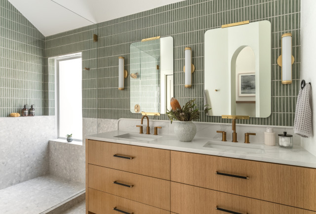 With the architecture reset, Getter layered in warmth and texture with glazed aloe green ceramic tiles, a custom white oak vanity and brass accents. Terrazzo-look porcelain flooring and a low-curb shower bring subtle pattern and energy.