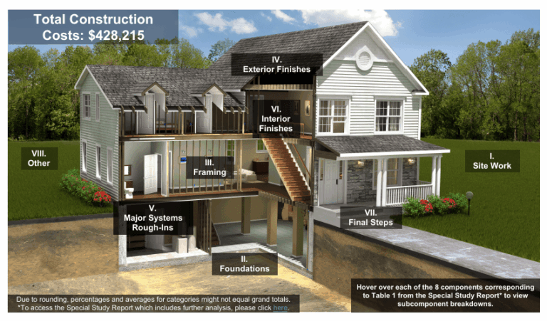 Construction costs were broken down into eight major stages of construction. Interior finishes, at 24.1%, accounted for the largest share of construction costs, followed by major system rough-ins (19.2%), framing (16.6%), exterior finishes (13.4%), foundations (10.5%), site work (7.6%), final steps (6.5%), and other costs (2.1%).