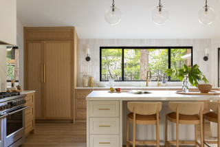 But after living with the kitchen for a number of years, they felt that while many of the elements looked and functioned fine, the bright white cabinets and blue island base dated the space. Seeking more warmth and a current look, they teamed up with designer Kerry Gillette, who used Houzz Pro software, for a refresh.