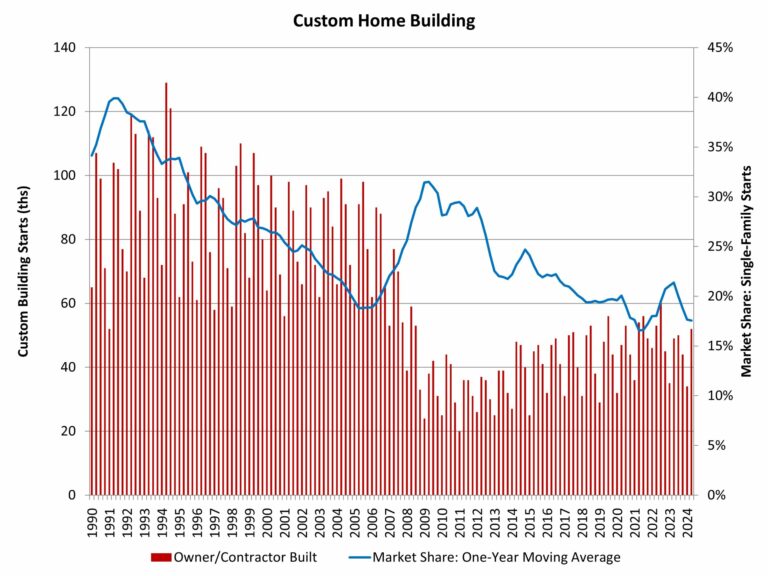 After share declines due to a rise in spec building in the wake of the pandemic, the market share for custom homes increased until 2023 and then entered a period of retrenchment. As measured on a one-year moving average, the market share of custom home building, in terms of total single-family starts, has fallen back to just under 18%. This is down from a prior cycle peak of 31.5% set during the second quarter of 2009 and a 21% local peak rate at the beginning of 2023.