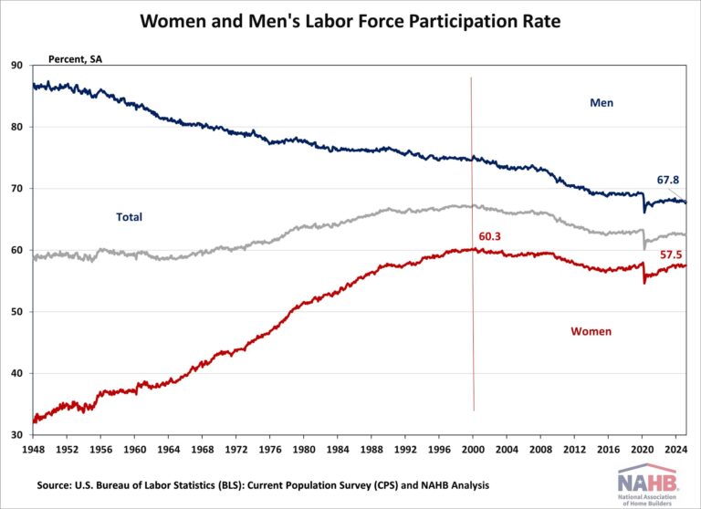 Historically, women’s labor force participation rate rose rapidly between 1948 and 2000, peaking around 60% in 1999. During the same period, men’s participation rates declined. However, since 2000, the growth in women’s labor force participation has flattened and then declined.