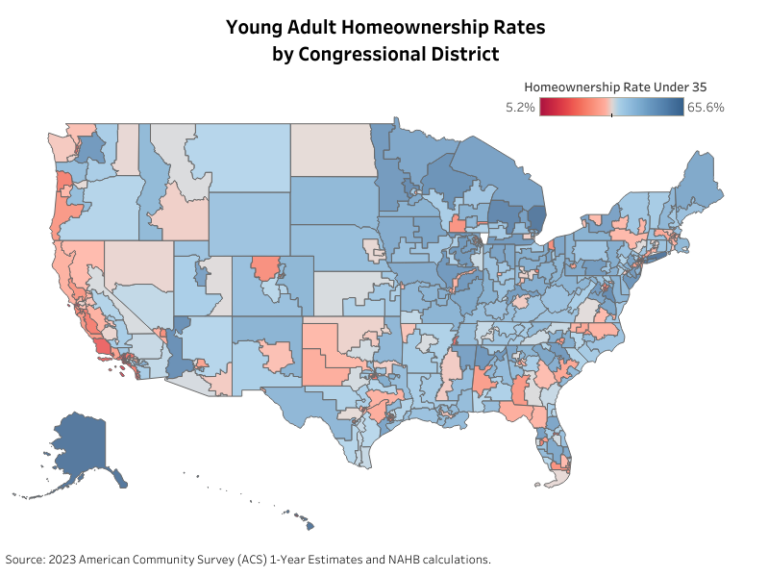 Congressional DistrictHispanic/Latino Homeownership RateOverall Homeownership RateShare of PopulationMichigan, District 178%80%2%Minnesota, District 676%81%3%Illinois, District 1676%80%5%Arizona, District 975%77%22%Texas, District 2375%74%58%Source: 2023 American Community Survey and NAHB calculations.