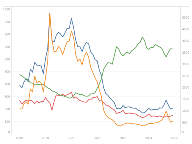 While prices of inputs to residential construction for services were down 0.3% over the year, they were up 0.5% in January from December. The price index for service inputs to residential construction can be broken out into three separate components: a trade services component, a transportation and warehousing services component, and a services excluding trade, transportation and warehousing component. The most significant component is trade services (around 60%), followed by services less trade, transportation and warehousing (around 29%), and finally transportation and warehousing services (around 11%). The largest component, trade services, was down 1.9% from a year ago. The services less trade, transportation and warehousing component was up 1.6% over the year. Lastly, prices for transportation and warehousing services advanced 3.1% compared to January last year, the largest year-over-year increase since January of 2023.
