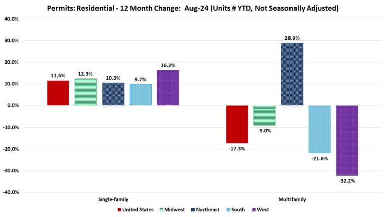 Year-to-date ending in June, single-family permits were up in one out of the four regions. The Midwest posted a small increase of 1.8%. The Northeast was 1.7% lower, the South was down by 6.5%, and the West was down by 8.1% in single-family permits during this time. For multifamily permits, three out of the four regions posted increases. The Midwest was up by 22.4%, the West was up by 8.0%, and the South was up by 7.1%, Meanwhile, the Northeast declined steeply by 30.0%, driven by the New York-Newark-Jersey City, NY-NJ MSA which declined by 40.0%.