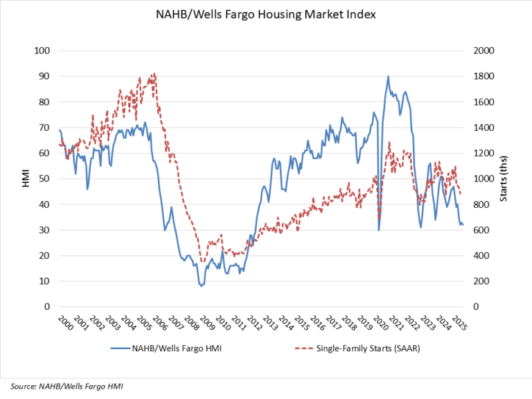 Builder confidence in the market for newly built single-family homes was 32 in August, down one point from July, according to the National Association of Home Builders (NAHB)/Wells Fargo Housing Market Index (HMI). Builder sentiment has now been in negative territory for 16 consecutive months and has hovered at a relatively low reading between 32 and 34 since May.