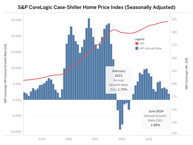 Home price growth continues to decelerate, according to the recent release of the S&P CoreLogic Case-Shiller Home Price Index (HPI). The S&P CoreLogic Case-Shiller HPI increased at a seasonally adjusted annual rate of 1.89% for June 2024, slowing from a revised rate of 3.28% in May. Home prices have not seen an outright decrease since January of 2023. However, 1.89% is the smallest growth in prices since February of 2023. Additionally, the growth rate has shown a generally declining trend since a peak of 9.76% in August 2023.