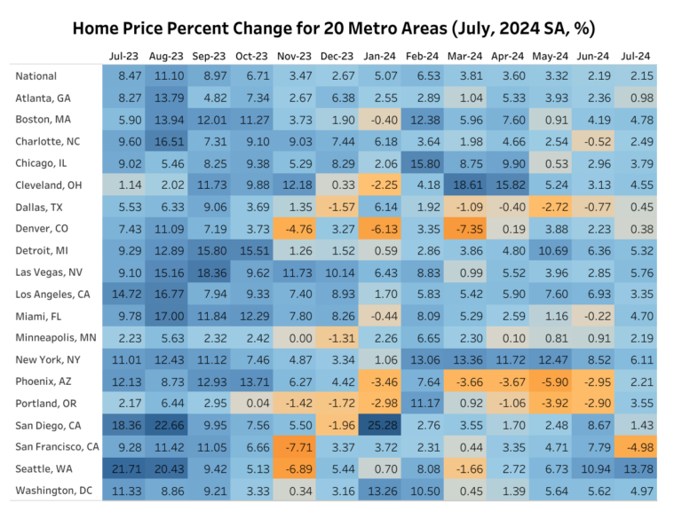 Home prices remain elevated but price growth continues to decelerate, according to the S&P CoreLogic Case-Shiller Home Price Index (HPI) recent release. The S&P CoreLogic Case-Shiller HPI (seasonally adjusted) reached its 14th monthly consecutive record high in July 2024. The index increased at a seasonally adjusted annual rate of 2.15%, down slightly from a revised June rate of 2.19%. This rate has slowed over the past six months, from a high of 6.53% in February 2024. The index has not seen an outright decrease since January of 2023 (nineteen months).