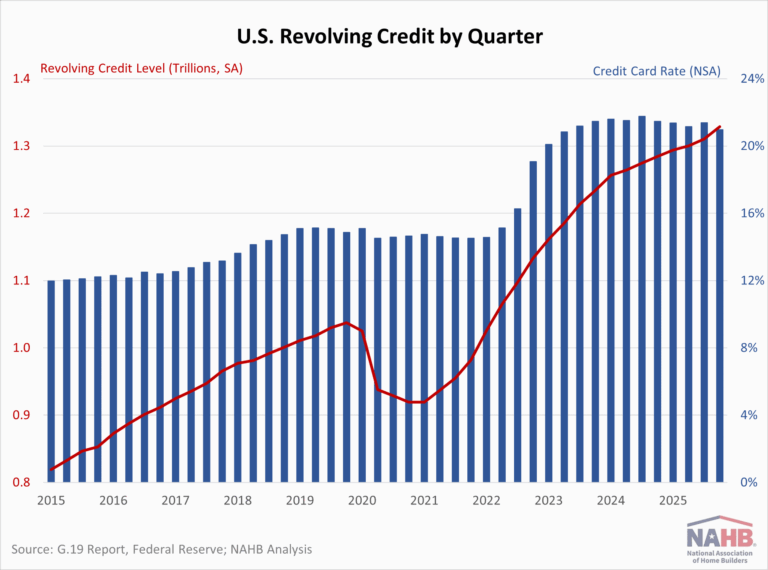 Overall consumer credit continued to expand in the fourth quarter of 2025, with growth in both nonrevolving and revolving credit. Nonrevolving credit, primarily student and auto loans, accounts for 74% of total outstanding consumer credit, while revolving credit, largely credit card balances, makes up the remaining 26%. Student loan and credit card balances continued to rise year-over-year, while auto loan balances declined. Although interest rates remain elevated, both credit card and auto loan rates edged slightly lower.