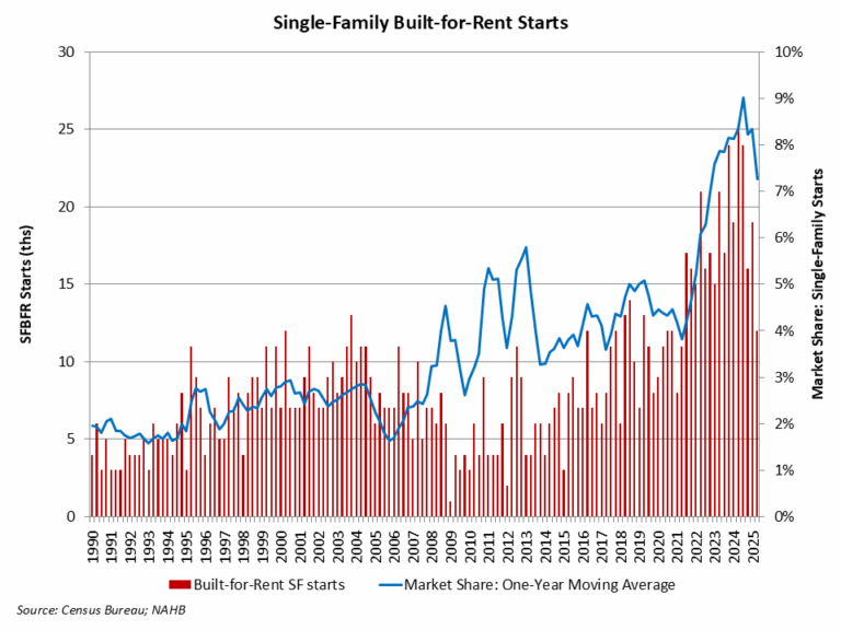 According to NAHB’s analysis of data from the Census Bureau’s Quarterly Starts and Completions by Purpose and Design, there were approximately 12,000 single-family built-for-rent (SFBFR) starts during the second quarter of 2025. This is down significantly relative to the second quarter of 2024 (25,000 starts). Over the last four quarters, 71,000 such homes began construction, which is a 16% decrease compared to the 85,000 estimated SFBFR starts in the four quarters prior to that period.