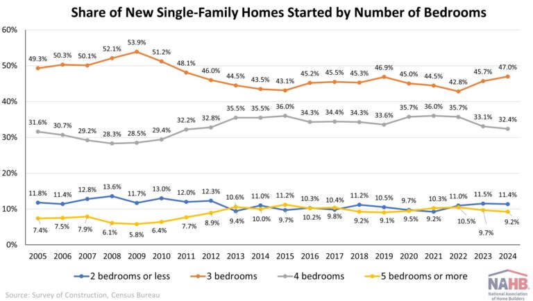 The share of single-family homes started with three bedrooms rose for the second straight year to its highest level since 2011 to 47.0%. All other bedroom number categories fell from 2023, with 4-bedroom homes falling the most from 33.1% to 32.4%, a 0.7 percentage point decline from the year prior. The share of single-family homes with 2 bedrooms or less remained greater than that of 5 bedrooms or more for the third straight year.